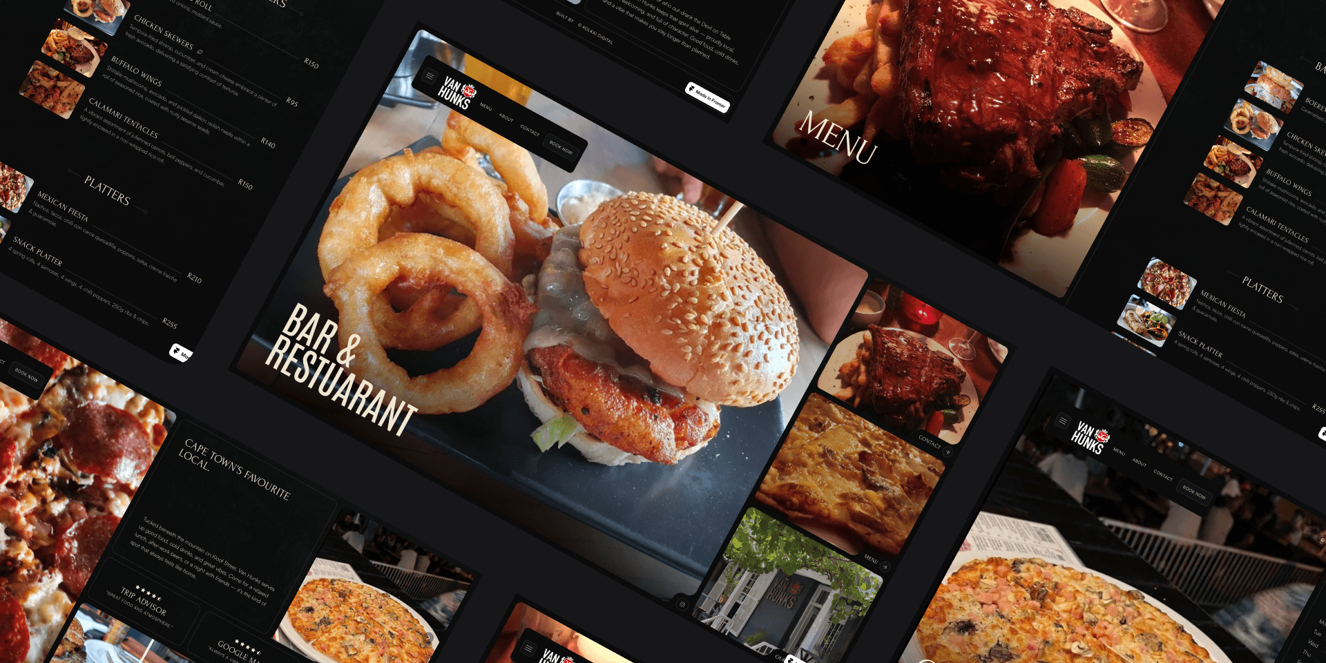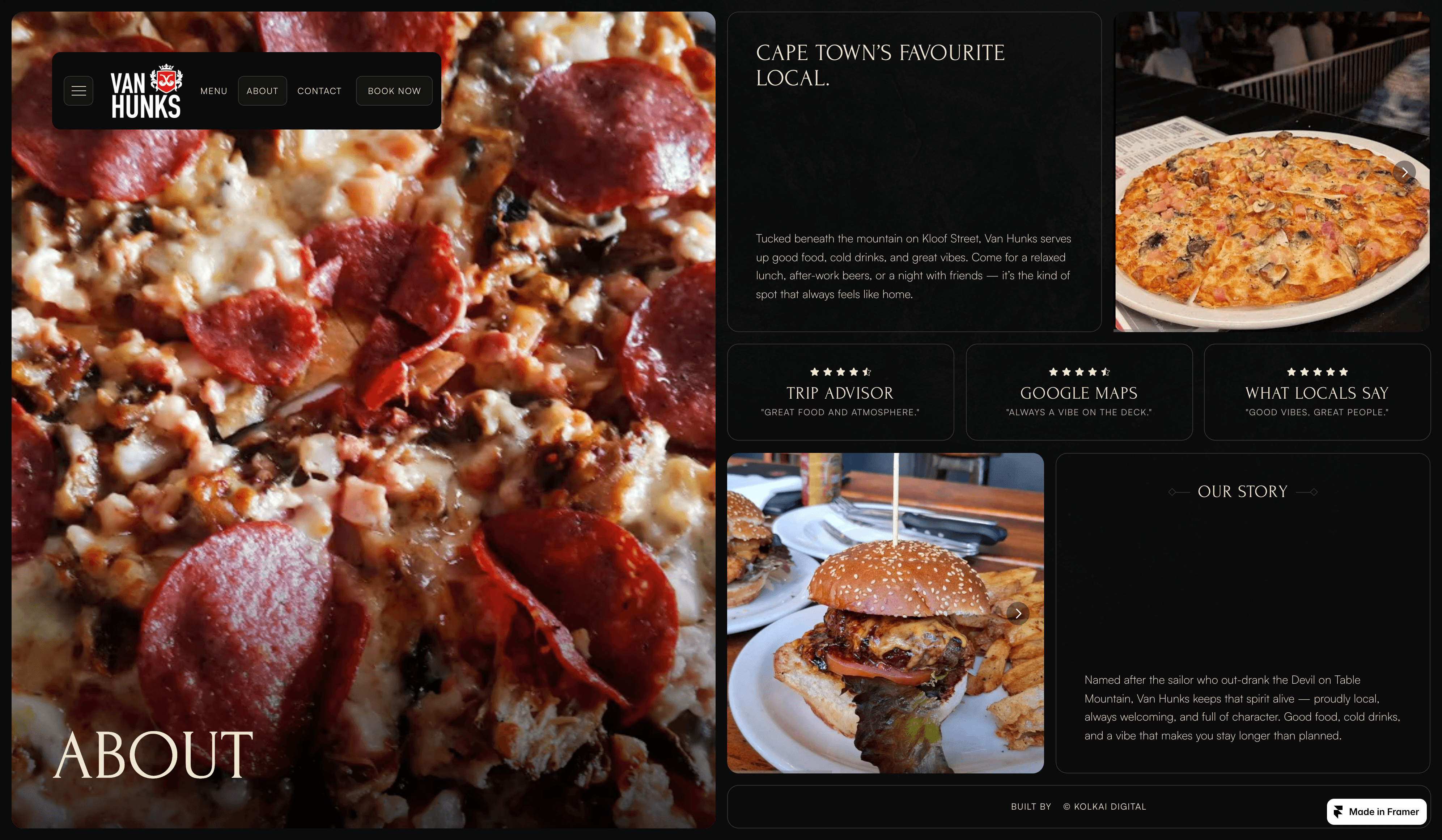 Every element was built for ease of use. The navigation focuses on what matters most — menu, bookings, and contact. Pages are fast to load and optimized for Google, making Van Hunks more visible to Cape Town locals searching for casual dining spots nearby.